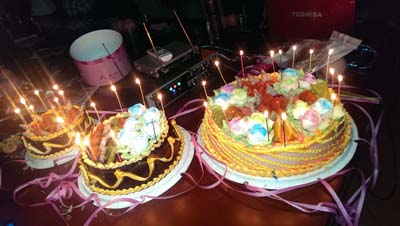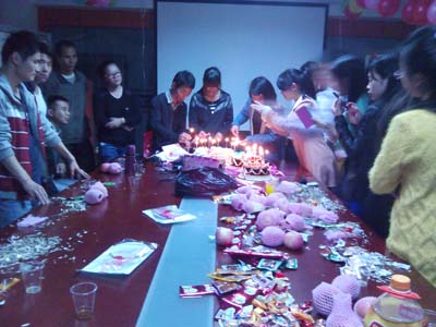 文藝節(jié)目表演完后,三個蛋糕,一個水果慕思蛋糕和兩個巧克力蛋糕被緩緩?fù)七M舞臺中央,閃爍的蠟燭也隨之躍動起來。主持人帶頭唱起《生日快樂》,所有同事都唱起生日快樂,給壽星們美好的生日祝福。熄燈,過生日的壽星們一起切下了生日蛋糕。