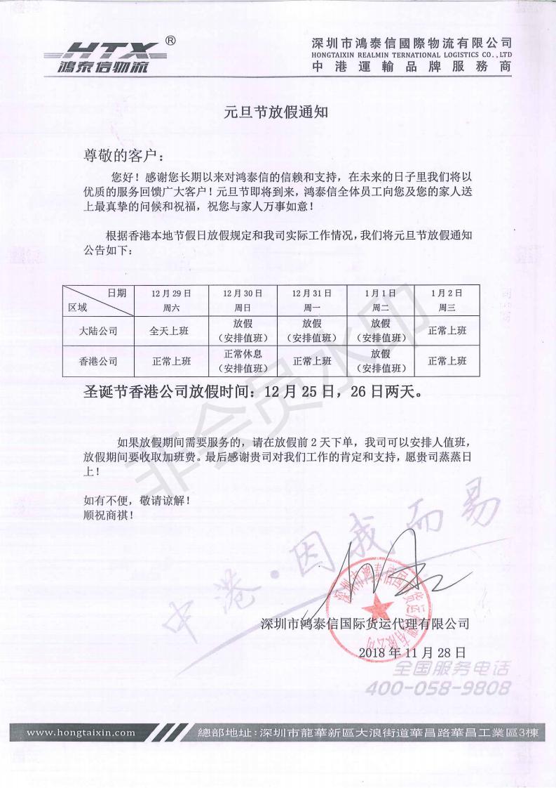 鴻泰信物流2019元旦放假通知