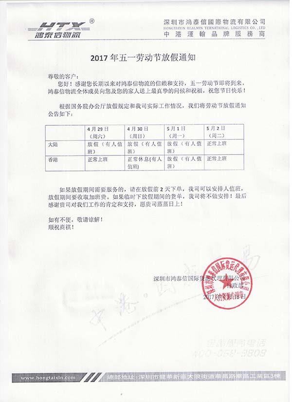 鴻泰信物流提前祝勞動(dòng)人民節(jié)日快樂,特將放假安排如下: