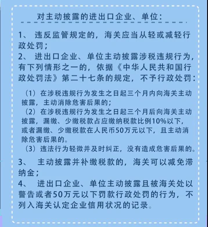 海關(guān)企業(yè)主動披露,是指與進出口貨物直接有關(guān)的企業(yè)、單位在進出口貨物放行后,自查發(fā)現(xiàn)其進出口活動存在少繳、漏繳稅款或者違反海關(guān)監(jiān)管規(guī)定的情況,主動向海關(guān)書面報告并接受海關(guān)處理,海關(guān)依法予以從輕、減輕處置的制度。