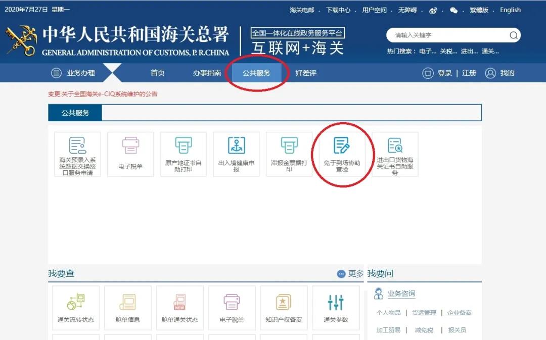 “互聯(lián)網(wǎng)+海關(guān)”一體化網(wǎng)上辦事服務(wù)平臺上“免于到場協(xié)助查驗(yàn)”申請模塊位于“公共服務(wù)”區(qū)域內(nèi),具體位置見上圖。