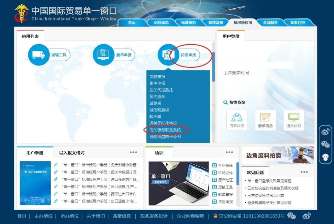 中國國際貿(mào)易“單一窗口”標(biāo)準(zhǔn)版“免于到場協(xié)助查驗(yàn)”模塊位于“貨物申報(bào)-海關(guān)事務(wù)聯(lián)系系統(tǒng)”內(nèi),具體位置見上圖。