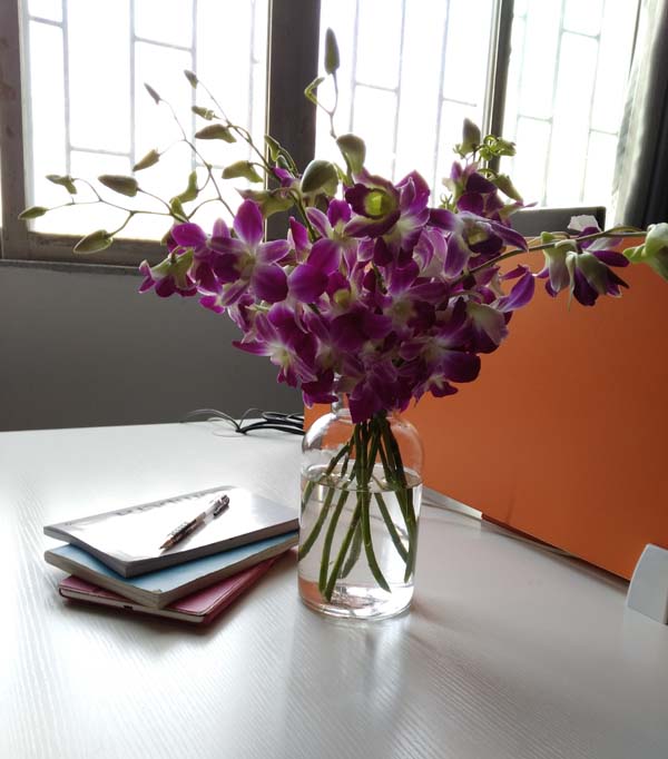A拆開(kāi)快遞,是一束紫色蘭花和一個(gè)透明的玻璃花瓶。A將花瓶注入水,然后將蘭花插入花瓶,一股淡淡的香氣云散開(kāi)來(lái)??粗欢渥?/span>色蘭花舒展花瓣,奔放的開(kāi)著,似一個(gè)笑臉。A的心情瞬間被點(diǎn)亮,繼續(xù)精神飽滿、激情昂揚(yáng)的投入到工作中,為中港貨運(yùn)事業(yè)的發(fā)展揮灑青春的汗水。