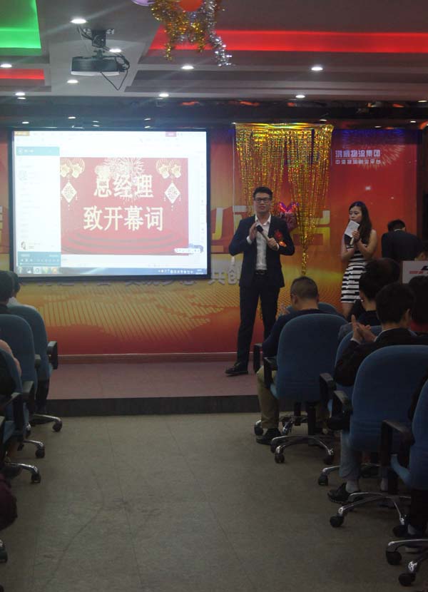 主持人手握話筒,舌燦蓮花,拉開晚會序幕,由李總致開幕詞。李總的開幕詞激情昂揚、簡短精致,勾畫2017年藍圖,高屋建瓴,振奮人心。