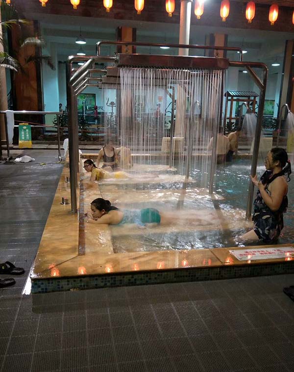 到達(dá)目的地聚餐后,泡溫泉,換上比基尼青春靚麗,溫潤(rùn)的泉水浸泡掉滿身的疲憊,特別是溫泉水柱按摩:從空中垂直噴薄而下,無(wú)數(shù)粗細(xì)均勻的水柱,直達(dá)趴在地面的人背上,微癢愜意,骨軟筋酥,通體舒暢。
